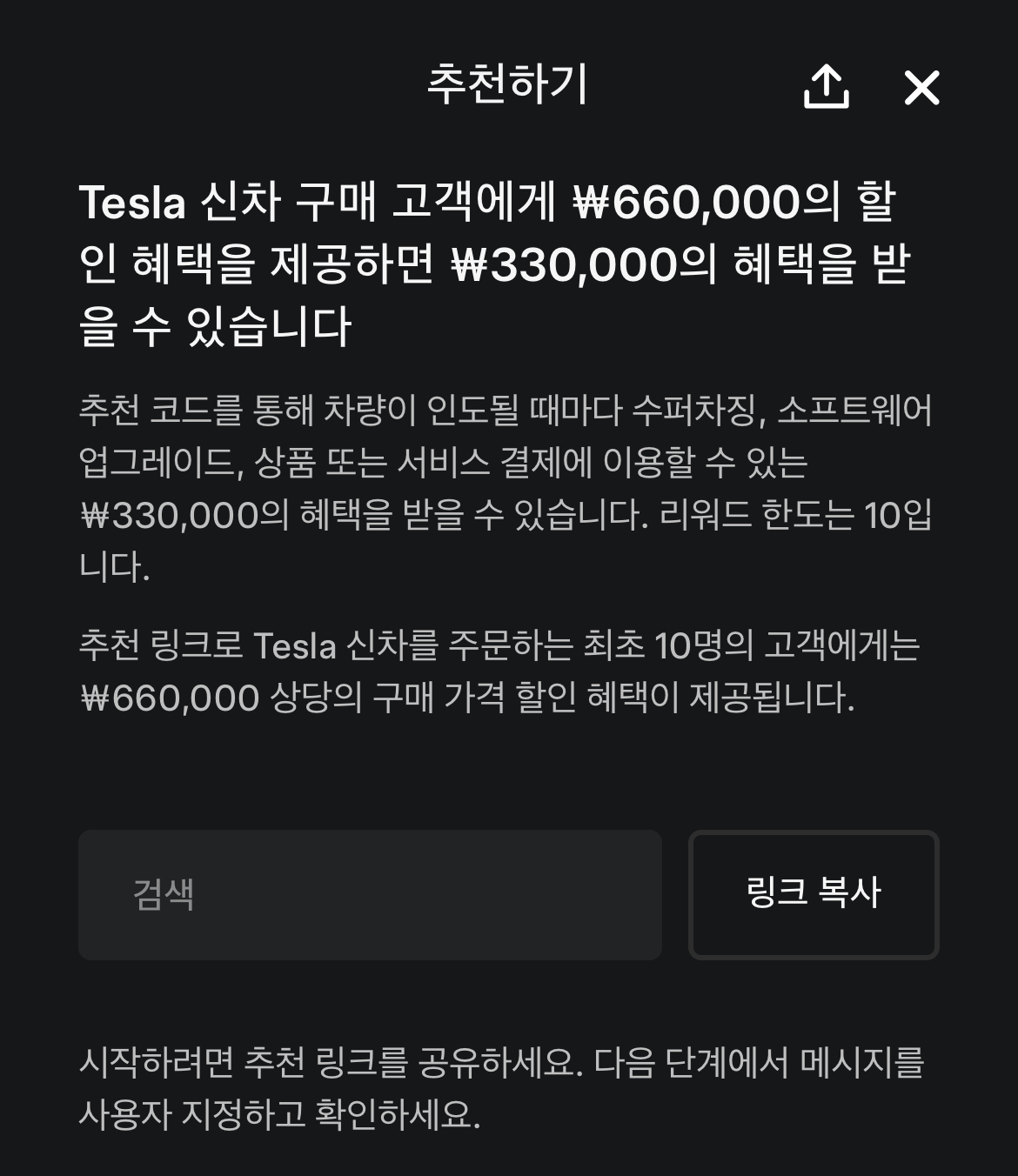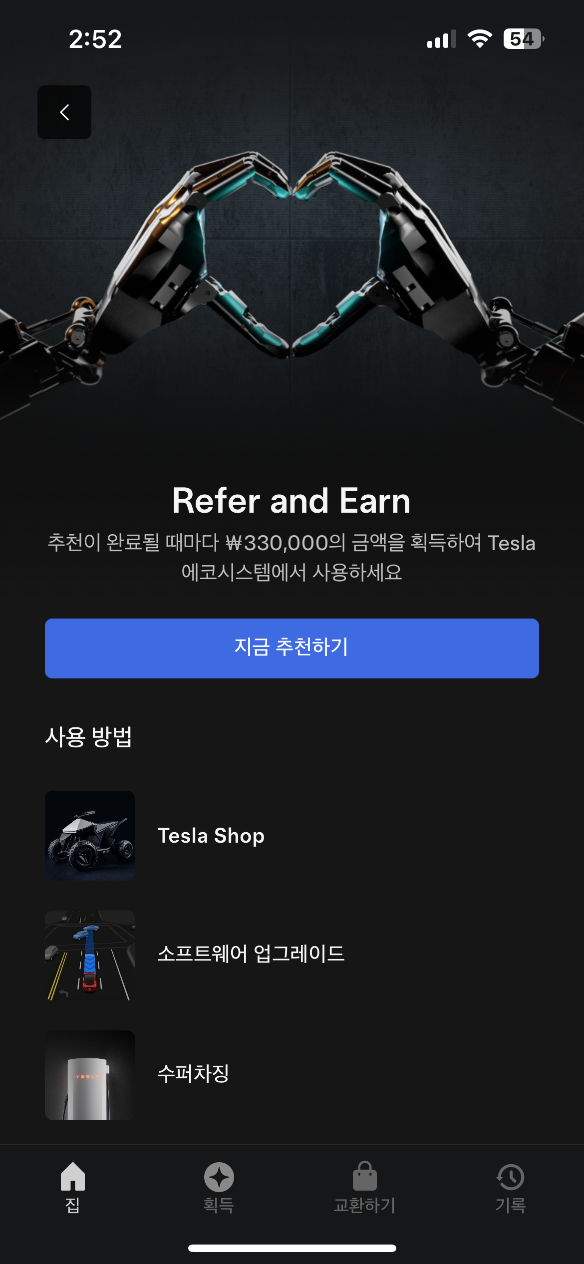 테슬라앱 메뉴 > 추천하고 보상받기 > 지금 추천하기