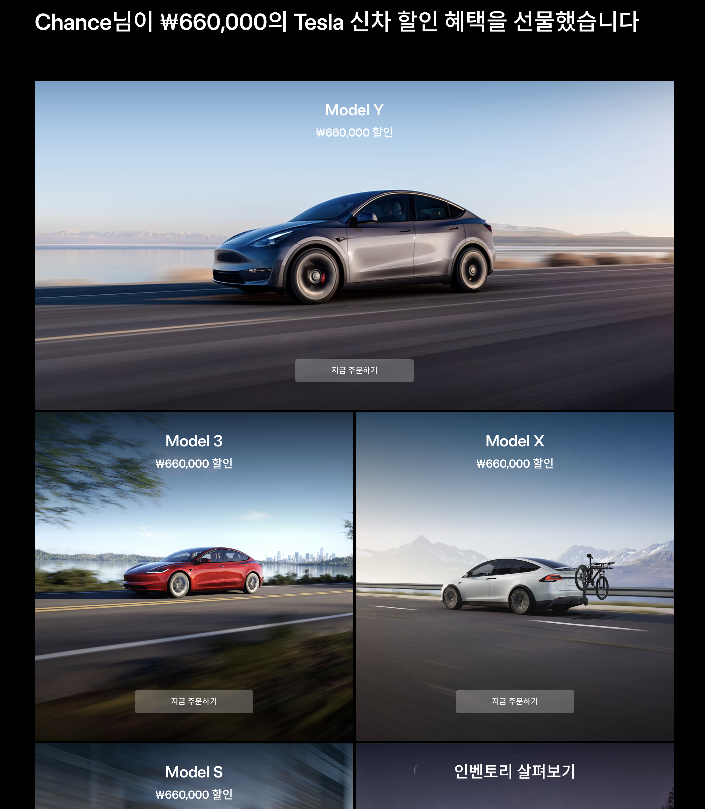 Chance님이 ₩660,000의 Tesla 신차 할인 혜택을 선물했습니다 인벤토리 살펴보기